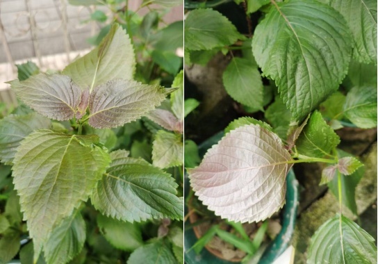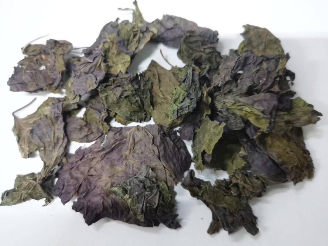 叶片多皱缩卷曲、破碎,完整者展平后呈卵圆形,长4~11cm,宽2.5~9cm。先端长尖或急尖,基部圆形或宽楔形,边缘具圆锯齿。两面紫色或上表面绿色,下表面紫色,疏生灰白色毛,下表面有多数凹点状的腺鳞。叶柄长2~7cm,紫色或紫绿色。质脆。带嫩枝者,枝的直径2~5mm,紫绿色,断面中部有髓。气清香,味微辛。