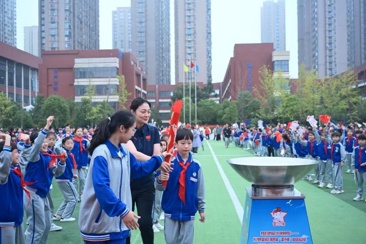 在火炬传递仪式上,奥运冠军向艳梅和小火炬手共同点燃第一棒火炬,手牵着手,迈着坚定的步伐,奔跑在跑道上,跳动的火焰象征着体育精神的生生不息。最后一棒的王娇老师也和一旁的小火炬手一同奔跑向终点,点燃圣火台,全场师生挥舞小国旗,火炬传递的每一个瞬间,都让体育拼搏的种子在学生心中悄然发芽。